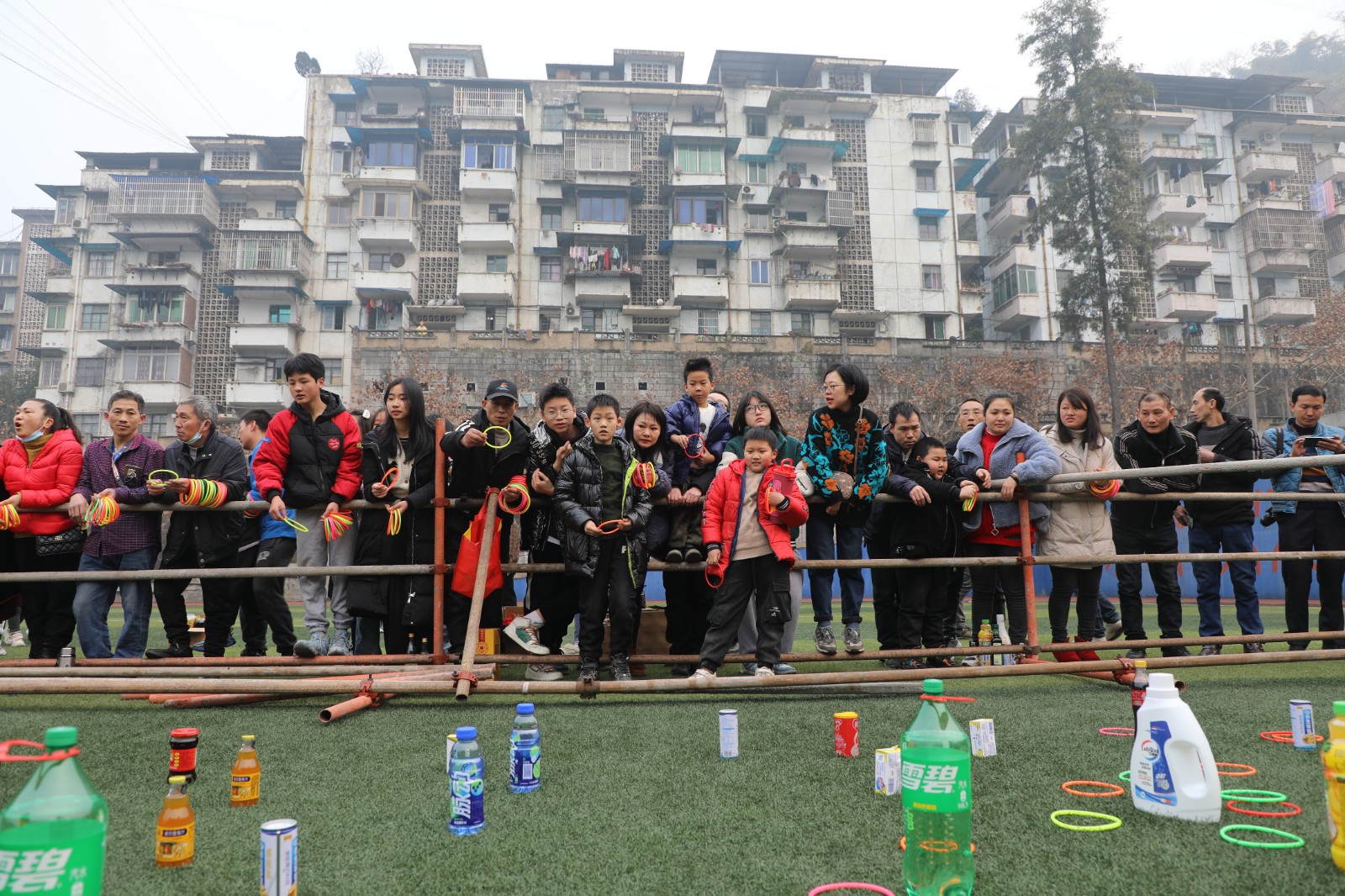 “實(shí)物套圈”與“貳柒拾”爭(zhēng)霸在官斗山足球場(chǎng)同步進(jìn)行,職工們攜妻帶子來(lái)到礦區(qū)“碰運(yùn)氣”。長(zhǎng)方形的活動(dòng)現(xiàn)場(chǎng)圍了個(gè)里三層外三層,等待“出擊”的家屬們,在彩圈售賣(mài)處排起的長(zhǎng)龍繞了兩道彎。凝神聚氣、預(yù)估距離,屏住呼吸、瞄準(zhǔn)目標(biāo),轉(zhuǎn)動(dòng)手腕、用力一揮,天空中快速閃過(guò)一道道美麗的拋物線。有套中目標(biāo)豐收喜悅的歡呼,有擦肩而過(guò)的嘆息與加油。套上三兩瓶好酒,回家過(guò)個(gè)熱鬧年,無(wú)論老少,眼里都是希望。