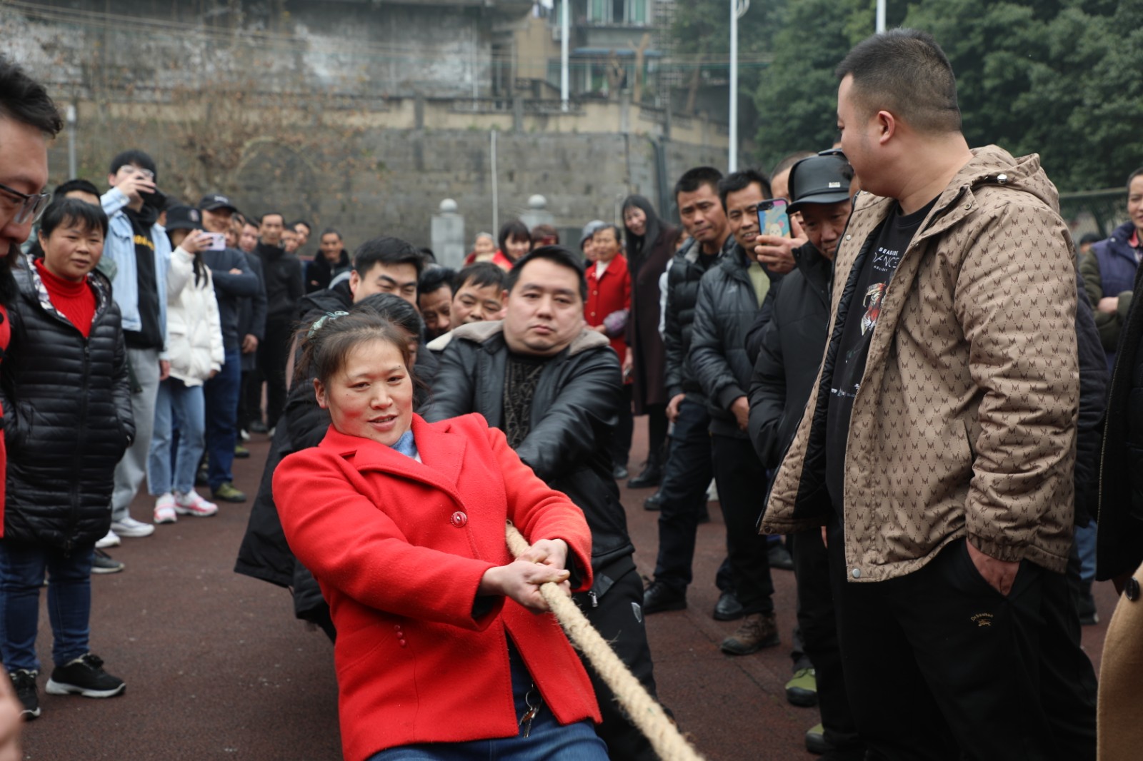 下午2點(diǎn)鐘,礦工拔河賽開(kāi)賽。清點(diǎn)人數(shù)、排好距離,抓緊繩子、身體盡力往后仰;在急促的哨聲中,繃直的繩子著上了力,選手們鉚足力氣往后拉;“一二、一二”節(jié)奏不斷,“加油、加油”此起彼伏;實(shí)力懸殊留回味,久久相持是看點(diǎn),在這歡樂(lè)的節(jié)日里,大人們拼力氣定勝負(fù)一笑泯恩仇,孩子們嬉戲打鬧湊熱鬧,一派祥和。