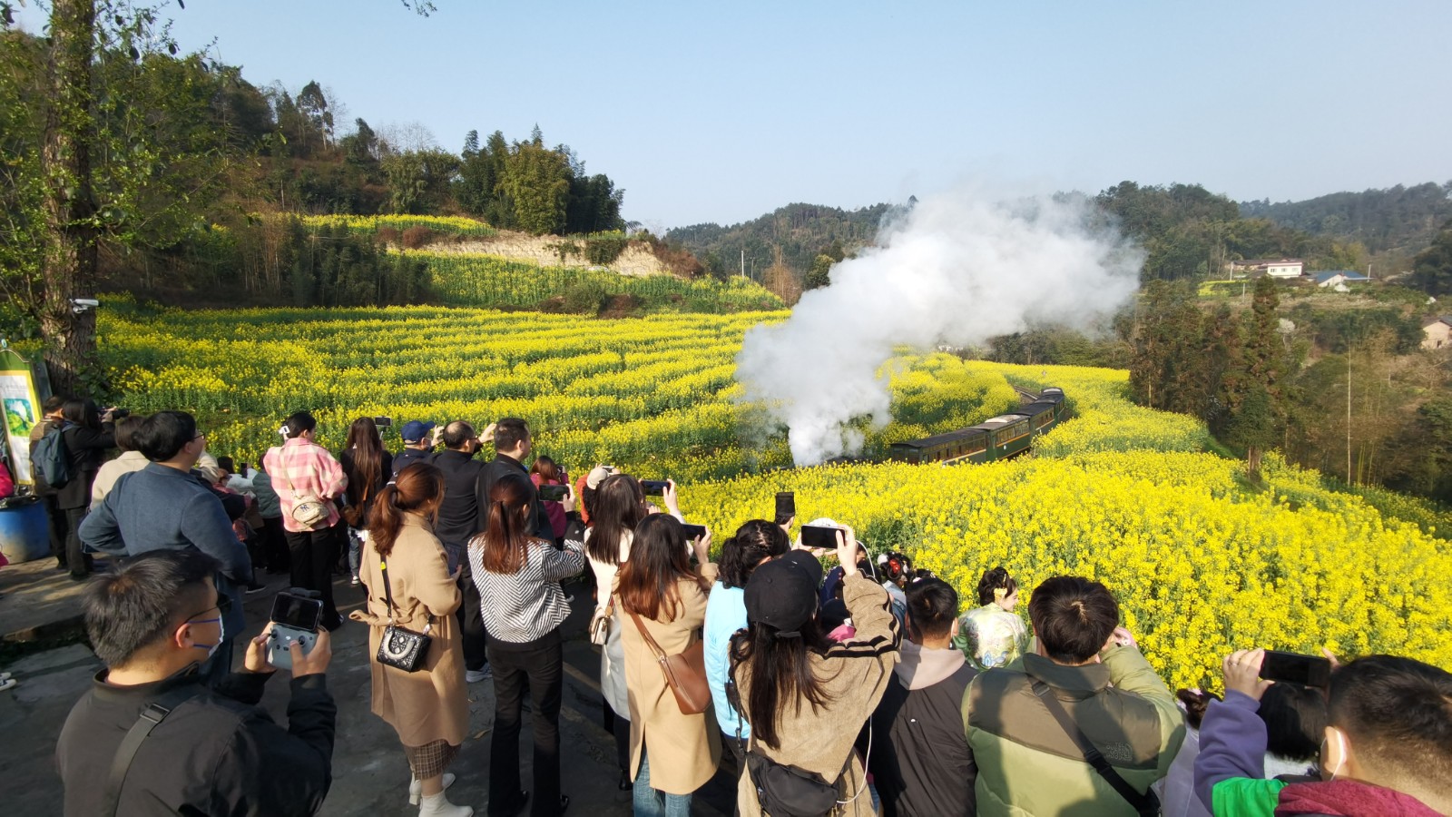 與往年不同,今年的短途賞花觀光專列到達段家灣,有專門的表演火車為游客表演。四川100個最美觀景·拍攝點——段家灣“人滿為患”;亮水沱景點同時種植了油菜花,犍為新八景之鐵龍飛虹呈現(xiàn)油菜花版新景觀,新景觀反響熱烈。