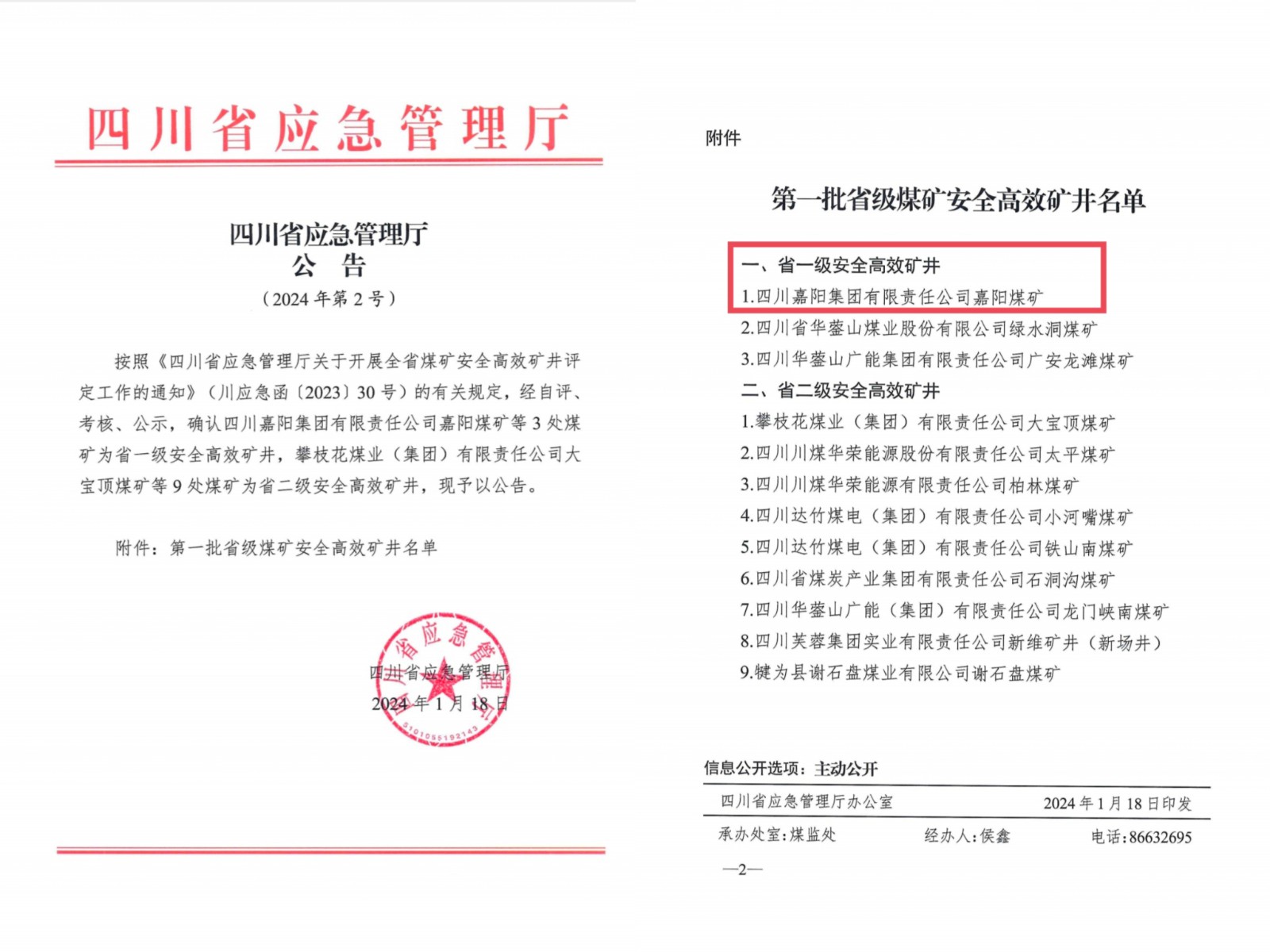1月18日,四川省應急管理廳(2024年第2號公告)公布了第一批省級安全高效礦井名單,嘉陽煤礦被評定為省一級安全高效礦井。