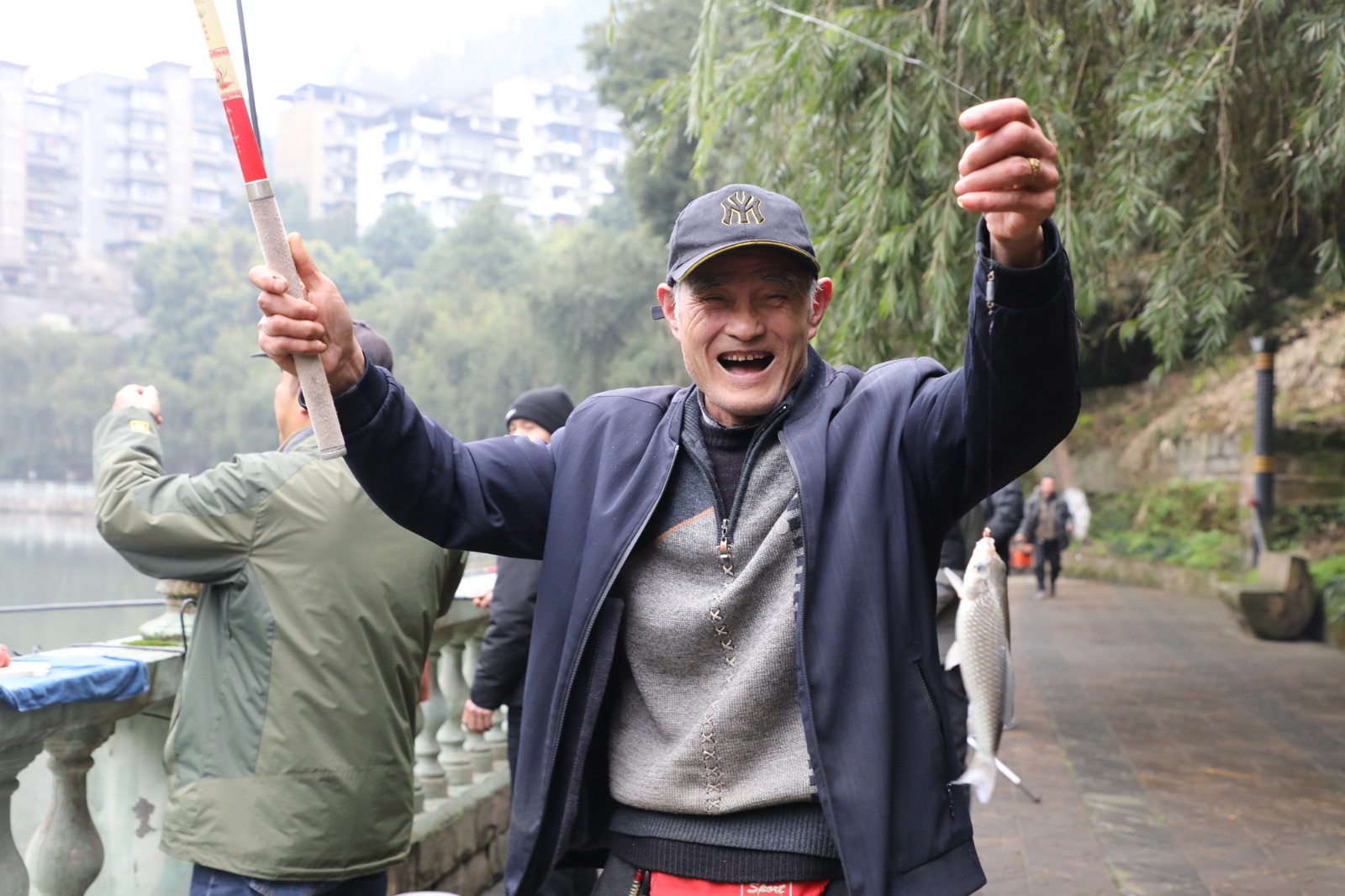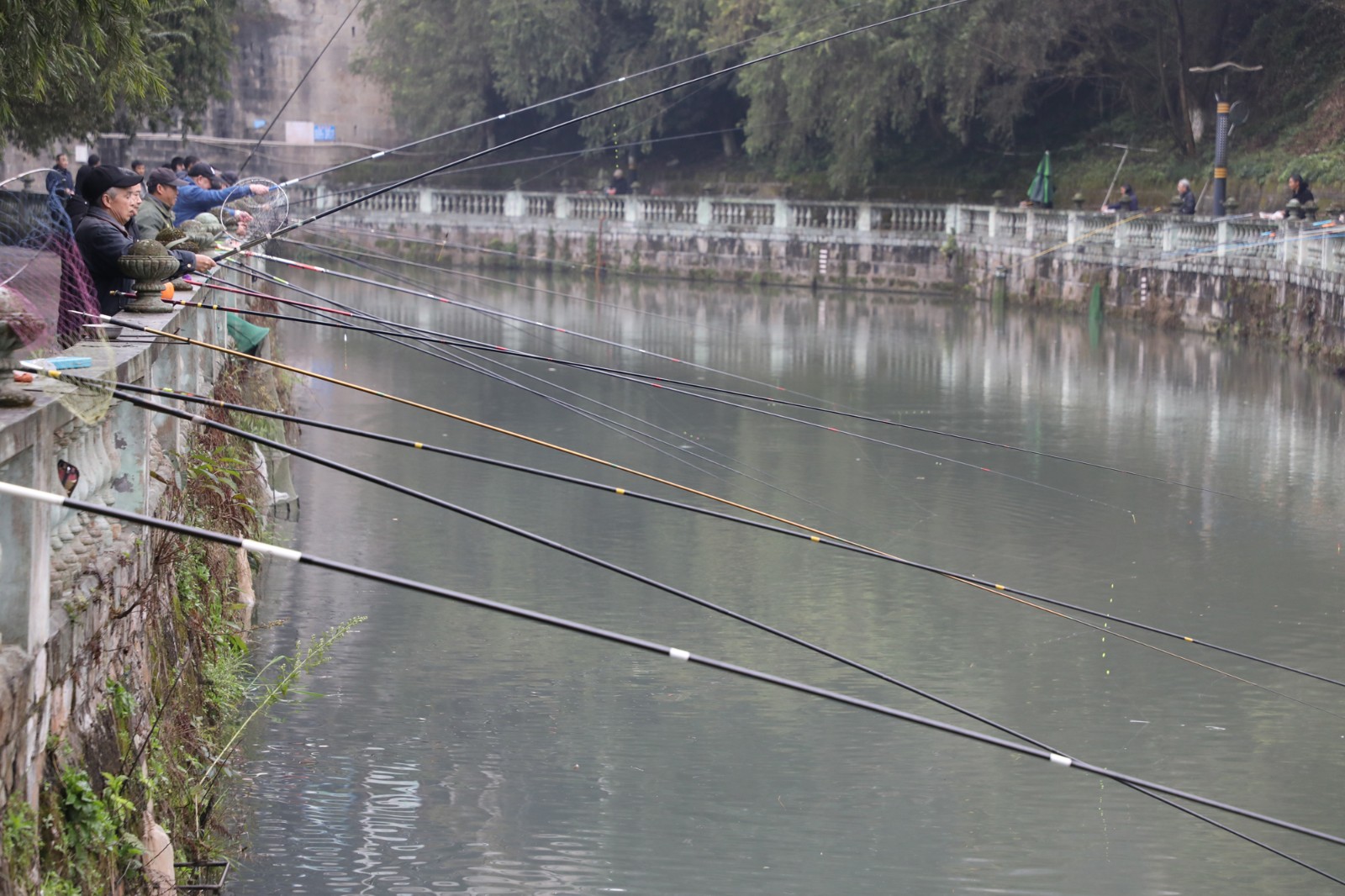 清晨,觀音溪畔微風輕拂、楊柳依依,釣魚活動在此舉行,河道兩岸早已圍滿了垂釣愛好者。水面波光粼粼,魚兒在水中歡快嬉戲,時不時躍出水面。釣魚者們全神貫注,眼睛緊緊盯著浮漂?;畋膩y跳的魚兒不時被拉出水面,岸上響起陣陣歡呼,喜悅之情溢于言表。