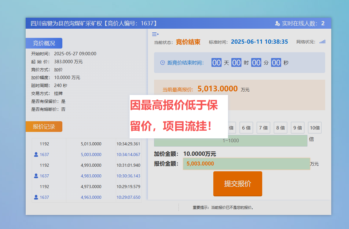 6月11日上午10點30分,四川省自然資源廳對四川省犍為縣芭溝煤礦采礦權(quán)進(jìn)行了網(wǎng)絡(luò)交易平臺競拍,經(jīng)過20余輪激烈競拍,最終因最高報價低于保留價,項目流掛。目前,資源仍屬于國家所有,預(yù)計自然資源廳將重新出讓。屆時,公司仍將積極參與競拍,力爭獲取礦權(quán)。