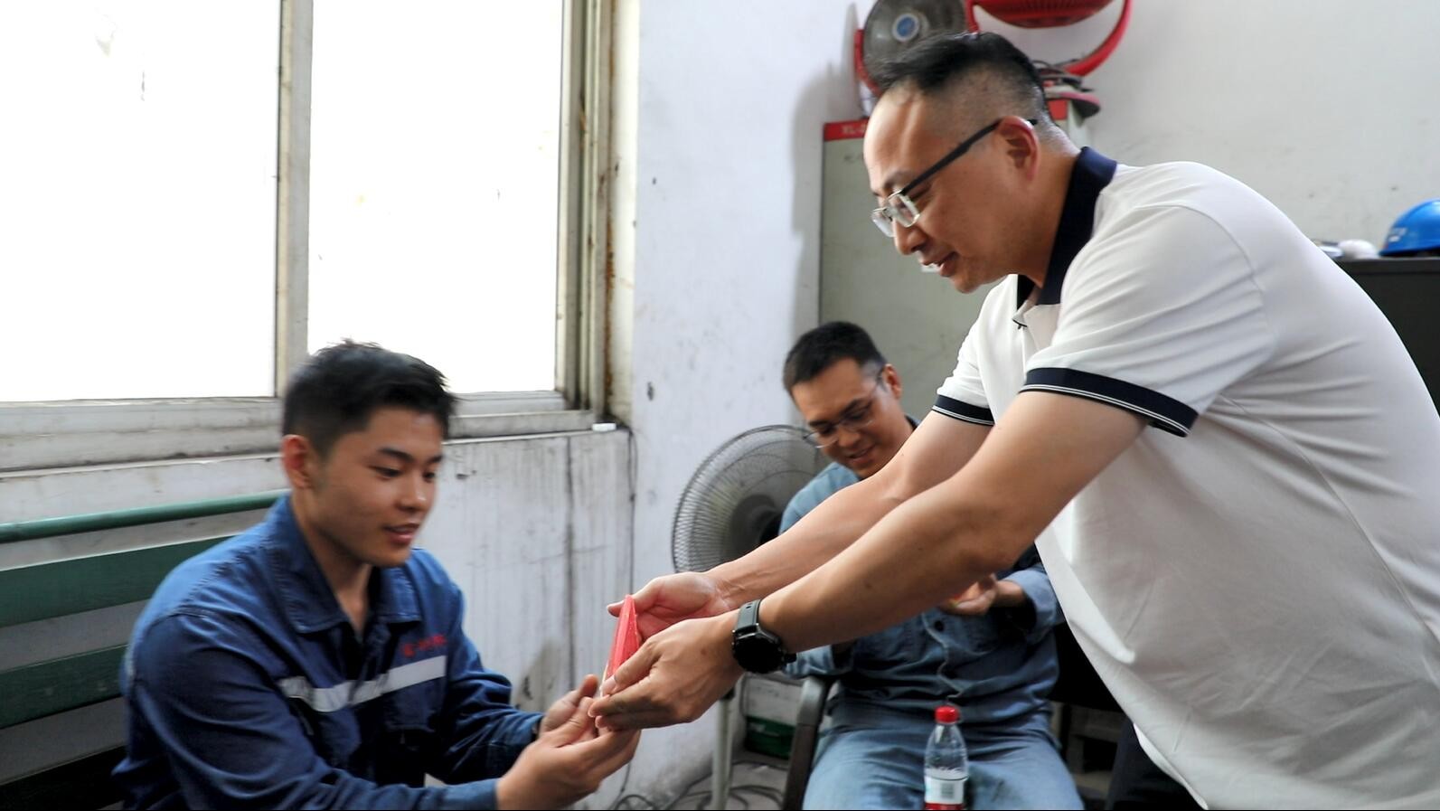 在機(jī)電制造維修分公司,財(cái)務(wù)總監(jiān)董鑒文和黨支部工作人員一起為車間職工切西瓜、送涼粉,傳遞黨組織的關(guān)心和慰問,提醒職工車間作業(yè)安全生產(chǎn)和防暑降溫工作要兩手抓兩手硬,保障職工安康。