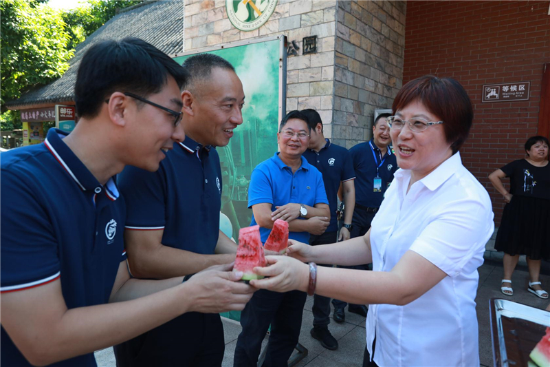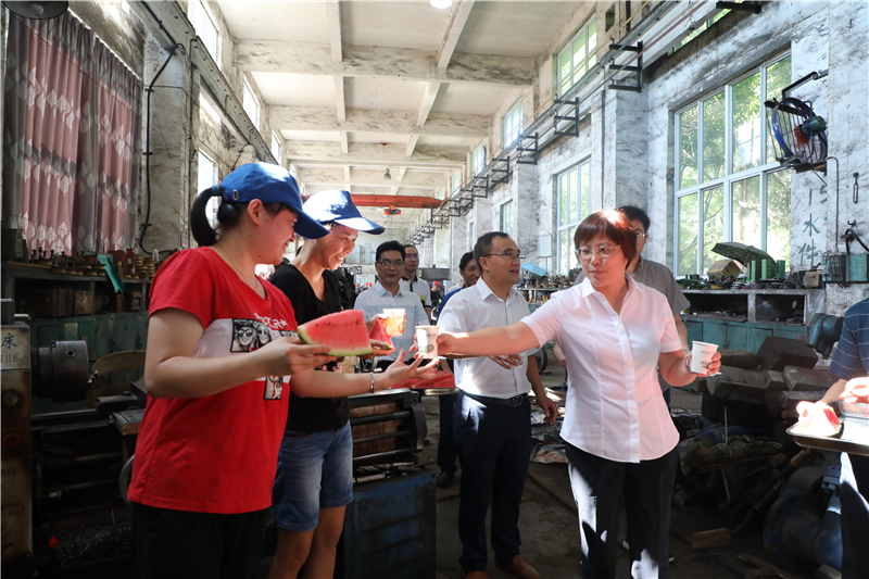劉曉揚(yáng)主席一行人不顧長(zhǎng)途行車的勞頓,下車直奔驕陽(yáng)下的嘉陽(yáng)煤礦井口工業(yè)廣場(chǎng),下車間、走作業(yè)現(xiàn)場(chǎng),劉曉揚(yáng)主席一邊招呼大家停下手中的工作休息,一邊將西瓜、冰粉、礦泉水等解暑飲品送到職工手中,并關(guān)切地詢問(wèn)職工生產(chǎn)、生活等情況,囑咐大家在高溫作業(yè)時(shí),要注意防暑降溫,增強(qiáng)自身安全防范意識(shí),合理安排作業(yè)內(nèi)容,確保自身身體健康和企業(yè)安全生產(chǎn)。
