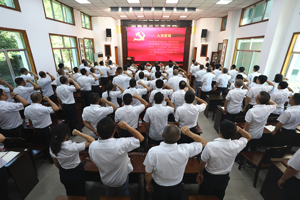 面對(duì)鮮紅的黨旗,100名共產(chǎn)黨員舉起右手,發(fā)出錚錚誓言,響亮的聲音在辦公樓久久回蕩。