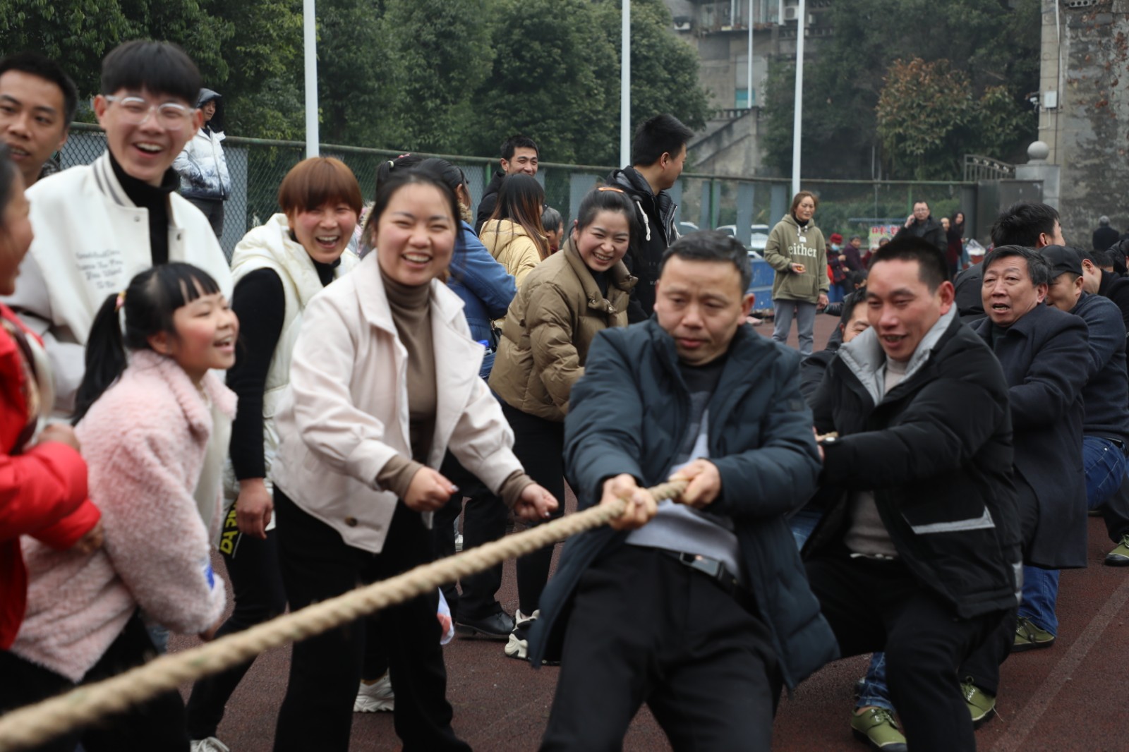 下午2點(diǎn)鐘,礦工拔河賽開(kāi)賽。清點(diǎn)人數(shù)、排好距離,抓緊繩子、身體盡力往后仰;在急促的哨聲中,繃直的繩子著上了力,選手們鉚足力氣往后拉;“一二、一二”節(jié)奏不斷,“加油、加油”此起彼伏;實(shí)力懸殊留回味,久久相持是看點(diǎn),在這歡樂(lè)的節(jié)日里,大人們拼力氣定勝負(fù)一笑泯恩仇,孩子們嬉戲打鬧湊熱鬧,一派祥和。