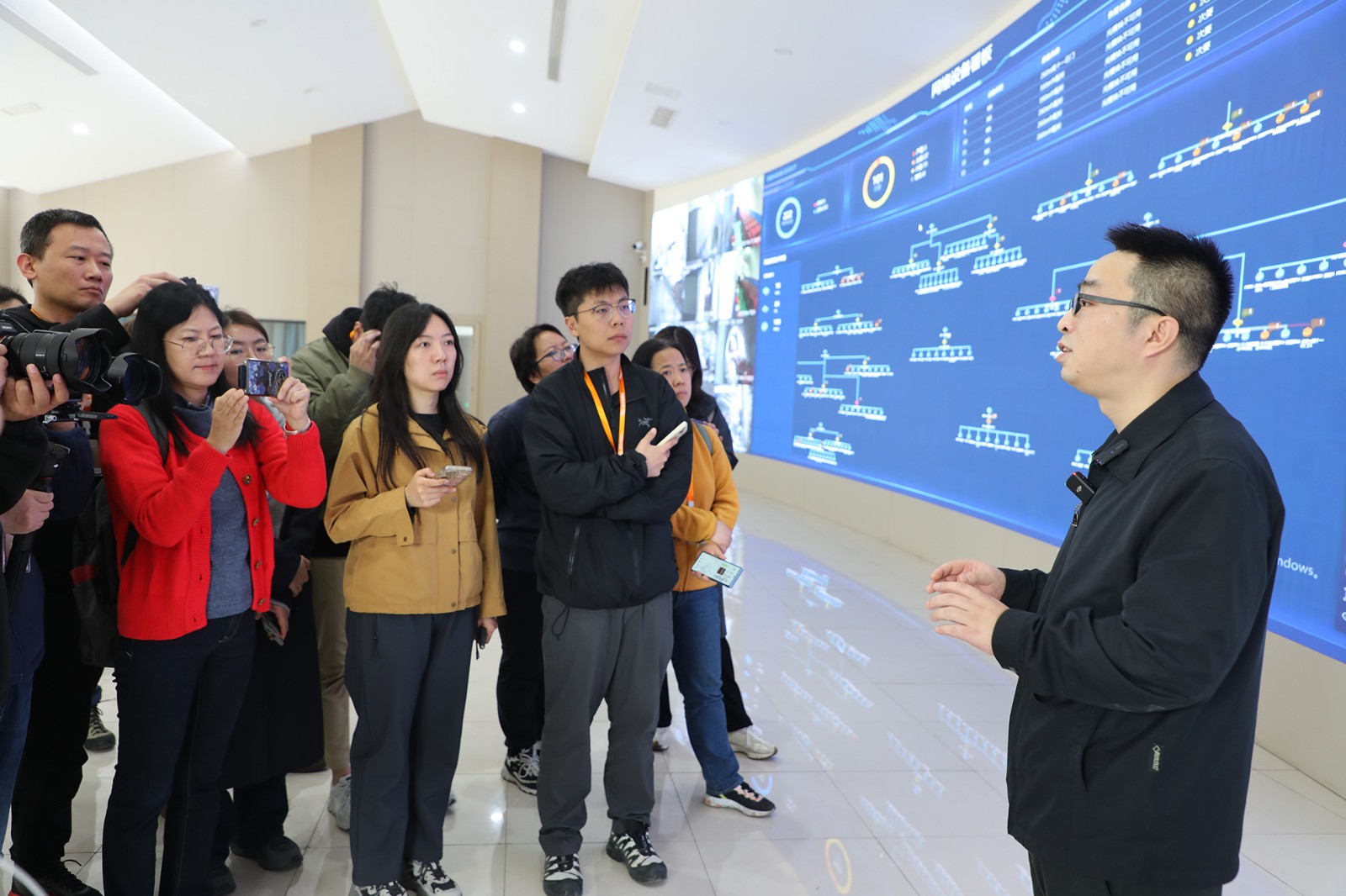 探訪團(tuán)部分記者與中興通訊公司和重慶研究院的18名男嘉賓在集團(tuán)副總經(jīng)理、總工程師袁成金的陪同下前往了嘉陽煤礦天錫井+215m水平中央水泵房,參觀了泵房中的5G網(wǎng)絡(luò)和通訊設(shè)施,試用了5G防爆手機(jī)的通訊功能,察看了無人值守啟動水泵排水過程。大家在地面調(diào)度中心,透過巨屏看到了嘉陽煤礦透明礦山信息系統(tǒng)成果展示,在采煤一隊智能化綜采地面遠(yuǎn)程操控室,聽取了專業(yè)技術(shù)人員介紹智能化生產(chǎn)線建設(shè)與成效。一路上,大家聚焦信息技術(shù)、5G技術(shù)、智能化技術(shù)和集團(tuán)遠(yuǎn)景規(guī)劃等不斷提問,隨行的嘉陽煤礦信息副總工程師但通和采掘副總工程師李有平耐心細(xì)致地給予講解答復(fù),氛圍友好而融洽。