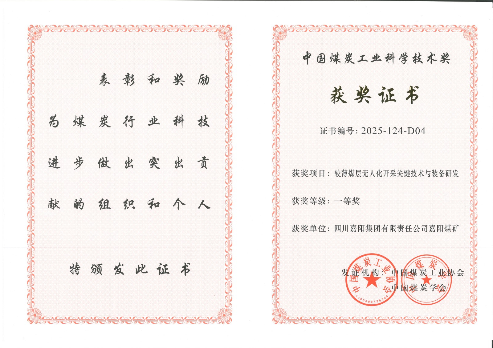 近日,2025年度中國煤炭工業(yè)協(xié)會科學(xué)技術(shù)獎獲獎結(jié)果揭曉,其中,四川嘉陽集團有限責(zé)任公司嘉陽煤礦的“較薄煤層無人化開采關(guān)鍵技術(shù)與裝備研發(fā)”項目,憑借出色的技術(shù)創(chuàng)新與應(yīng)用成效榮獲一等獎。