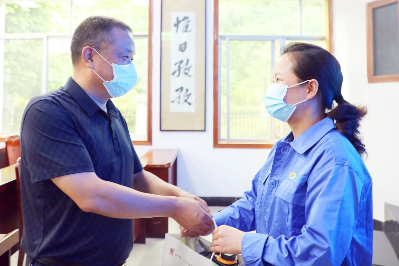 在一樓會議室,鄧安林一行對堅守在一線的職工們代表們致以誠摯的問候和崇高的敬意,為他們送上水杯、金銀花、菊花茶等防暑降溫物品,并詳細了解職工的生產(chǎn)工作情況和高溫勞動防護措施落實情況,叮囑廣大職工做好疫情防控和自身防暑降溫工作,合理調(diào)整作息時間,確保安全生產(chǎn)。鄧安林強調(diào),企業(yè)要努力為職工創(chuàng)造良好的生產(chǎn)作業(yè)環(huán)境,切實保障職工安全和身體健康,提高職工群眾的獲得感、幸福感、安全感,營造企業(yè)與職工共創(chuàng)共享的和諧氛圍。