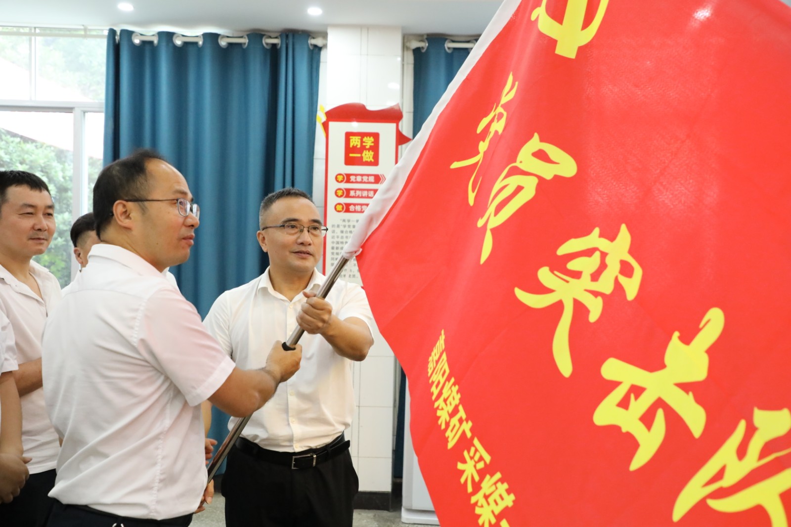 黨委書記杜勤將印有“黨員突擊隊(duì)”大字的嶄新旗幟鄭重授予采煤一隊(duì)黨支部書記黃建,希望黨支部高舉旗幟,團(tuán)結(jié)全體黨員攜手前行,以更加飽滿的熱情在企業(yè)高質(zhì)量發(fā)展征程上再創(chuàng)佳績。